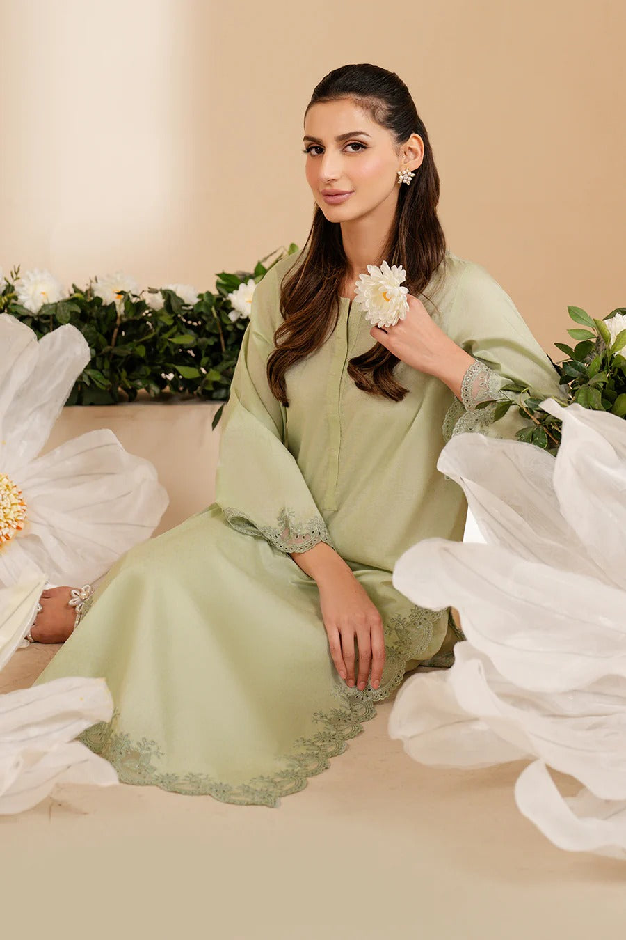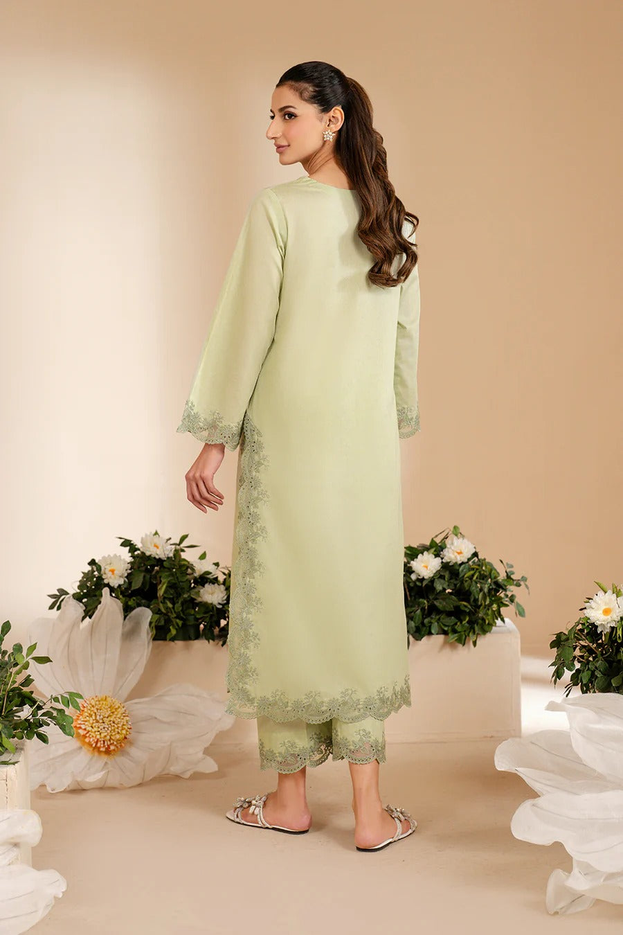 ✔ Delicate embroidery on sleeves, hemline, and trousers for a refined finish.